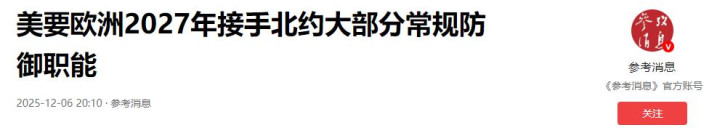 路透社12月初的消息显示,美国防部已经明确告知多个欧洲盟友,要求他们在2027年前全面接手北约大部分常规防务任务。